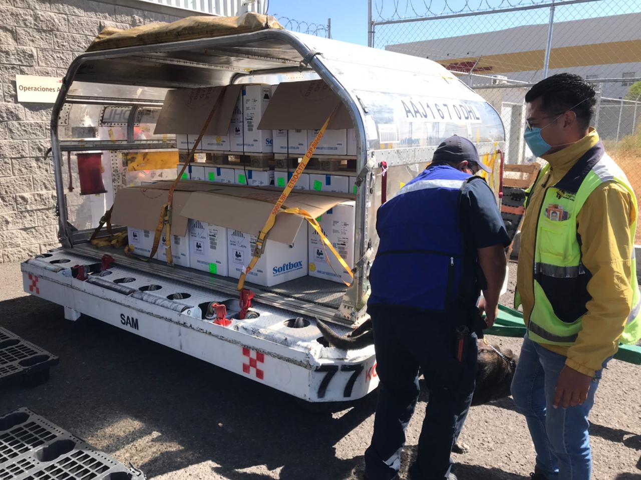 Una vez que fue descargado el avión, se procedió al proceso de desaduanización, iniciando con la revisión con un binomio canino para verificar que la carga no contuviera elementos ilegales. Posteriormente, en el área de reconocimiento aduanero y en conjunto con personal de COFEPRIS, verificaron la cantidad de dosis de la vacuna que conformaron el embarque.