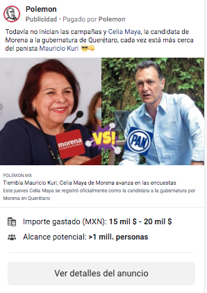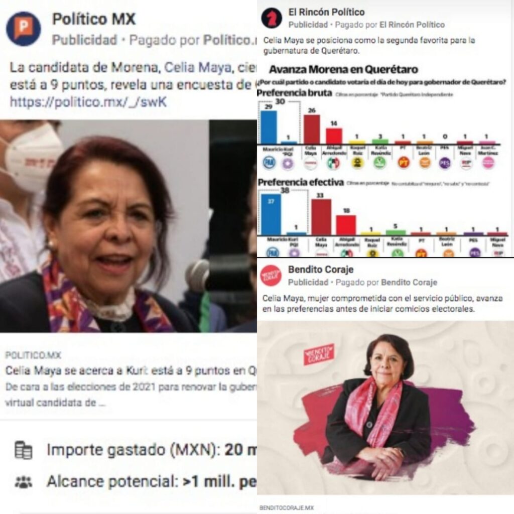 De acuerdo a la biblioteca de anuncios de Facebook, sitios como «Polemon» cuyos contenidos son -en su mayoría- para defender al presidente Andrés Manuel López Obrador y a sus políticas, pagaron 20 mil pesos entre el 26 de marzo y el 2 de abril para divulgar la nota «Tiembla Mauricio Kuri; Celia Maya de Morena avanza en las encuestas» y refieren un estudio de opinión atribuido a la empresa Parametría en donde separan a la ex magistrada por cifras menores a un dígito con respecto al candidato panista.