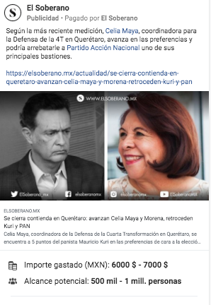 Páginas afines a Morena, sitios de noticias que ni siquiera tienen sede en el estado de Querétaro y «jugosas» pautas publicitarias que tienen como fin posicionar a la candidata de Morena a la gubernatura de Querétaro, Celia Maya, son el común denominador de varios «sitios informativos» que en las últimas semanas no sólo han replicado información sobre encuestas que aparentan acercar a la ex magistrada al candidato panista Mauricio Kuri, sino que además han contratado publicidad a Facebook de manera segmentada para incrementar su penetración entre los internautas queretanos.