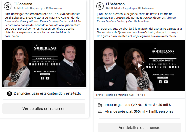Es así que fue posible detectar que en al menos 5 páginas de facebook, se han erogado más de 1 millón y medio de pesos en publicidad política, utilizada primordialmente para posicionar posteos que posicionen a candidatos afines al partido del presidente Andrés Manuel López Obrador o bien que denigren a sus contrincantes políticos.