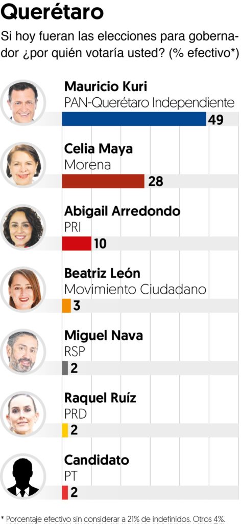 Mientras, el diario especializado en temás económicos «El Financiero» le da también una cómoda ventaja a Kuri situándolo como puntero con 49 puntos porcentuales contra 28 de Celia Maya.