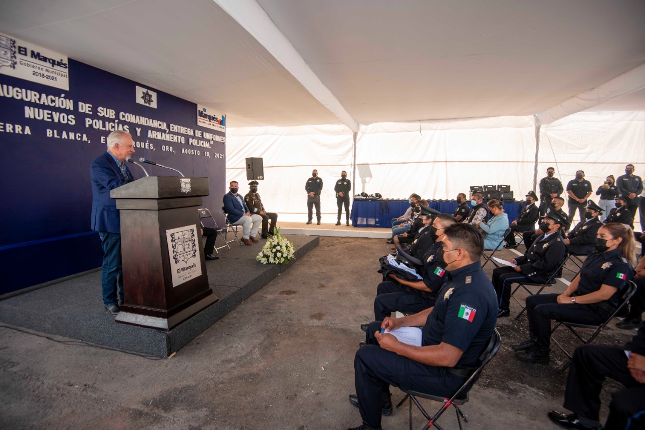 El presidente municipal de El Marqués, Enrique Vega Carriles, encabezó la inauguración de la Subcomandancia de la Secretaría de Seguridad Pública y Tránsito Municipal (SSPyTM) en la comunidad de Tierra Blanca, así como la entrega de equipamiento táctico y uniformes y la presentación de 19 nuevos elementos de la Secretaría de Seguridad Pública y Tránsito Municipal de El Marqués.