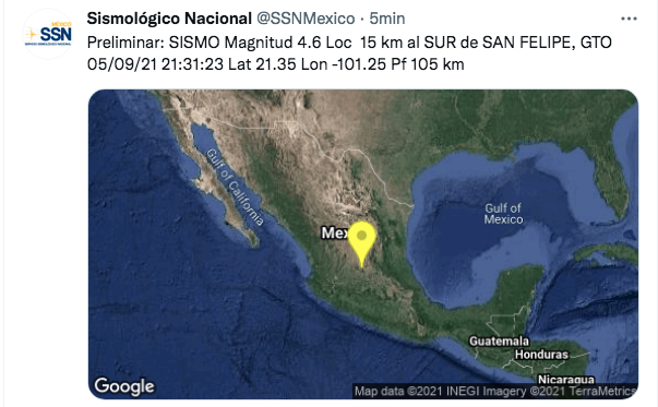 Preliminar: SISMO Magnitud 4.6 Loc 15 km al SUR de SAN FELIPE, GTO 05/09/21 21:31:23 Lat 21.35 Lon -101.25 Pf 105 km pic.twitter.com/1FtW0vW9gh