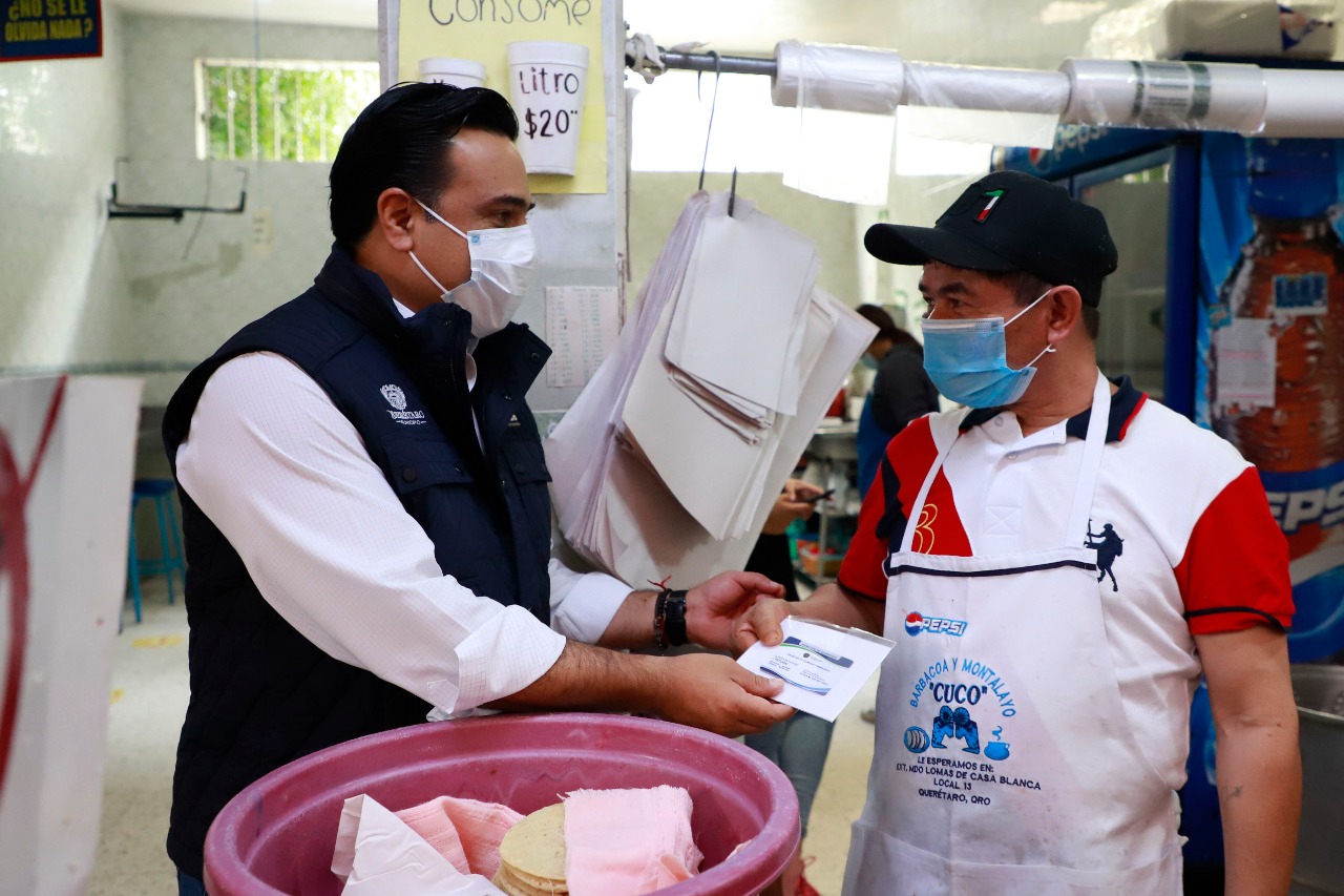 El Presidente Municipal de Querétaro, Luis Nava, visitó el mercado de Lomas de Casa Blanca, para supervisar la entrega de credenciales y pólizas a beneficiarios del programa Salud en Tu Tianguis y Mercado, con el cual se contribuye al bienestar social y económico de las familias de las y los locatarios de mercados y tianguistas de la capital.