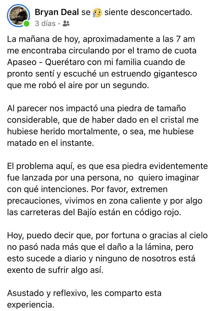Ya sea que vayas o que vengas, que seas de Querétaro o de Guanajuato, viajar por las carreteras de nuestro vecino estadose ha vuelto un riesgo constante, debido a los robos de los que han sido objeto muchos conductores y sus familias que transitan -sobre todo- por la carretera libre a Celaya (a decir verdad hasta en la de cuota pasan cosas) e incluso hasta ataques armados como el que sufrió el pasado día domingo 17 de octubre de 2021 una familia producto del cual una mujer perdió la vida.