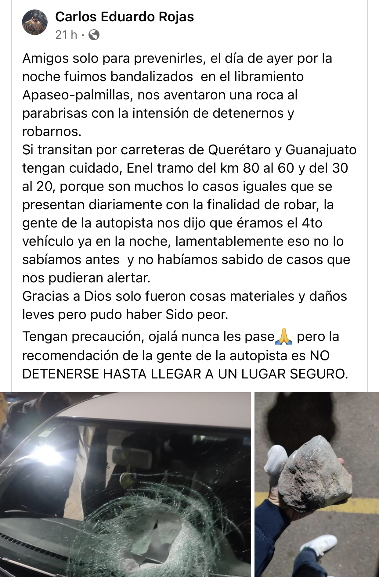 Estos hechos están ocurriendo con suma frecuencia en la carretera libre Querétaro-Celaya, claro del lado del estado de Guanajuato entre los apaseos, pero también en el libramiento Apaseo-Palmillas, donde parece que no existe la ley y ninguna autoridad hace nada para cuidar a quienes tienen necesidad de transitar por esa vía.