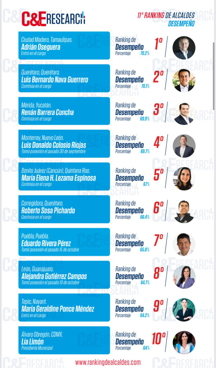 En sexto lugar aparece Roberto Sosa Pichardo, presidente municipal de Corregidora; en séptimo Eduardo Rivera López, alcalde de Puebla; en octavo Alejandra Gutiérrez Campos de León, Guanajuato, en noveno María Geraldine Ponce de Tepic, Nayarit y finalmente en décimo Lía Limón, alcaldesa de Álvaro Obregón en la Ciudad de México.