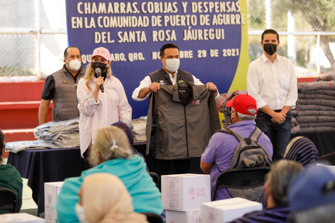 Con la finalidad de apoyar y proteger a la población más vulnerable durante esta época invernal, el Presidente Municipal de Querétaro, Luis Nava en compañía de su esposa y Presidenta Del Sistema Municipal DIF, Arahí Domínguez, dio inicio a la entrega de chamarras, cobijas y despensas para grupos de adultos mayores, en este primer día en la comunidad de Puerto de Aguirre de la Delegación Santa Rosa Jáuregui.