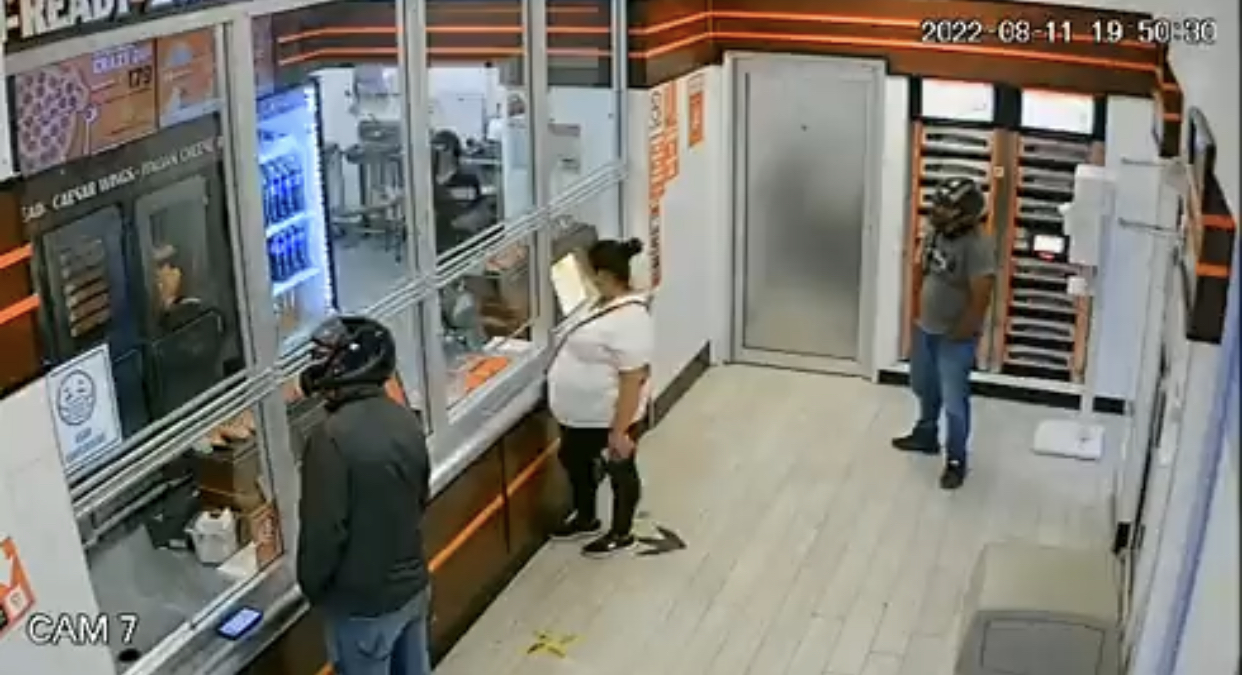 En el video se puede observar que los tres civiles, una mujer y dos repartidores están a la espera de que sus pedidos sean entregados cuando de pronto llegan las ráfagas de balas.