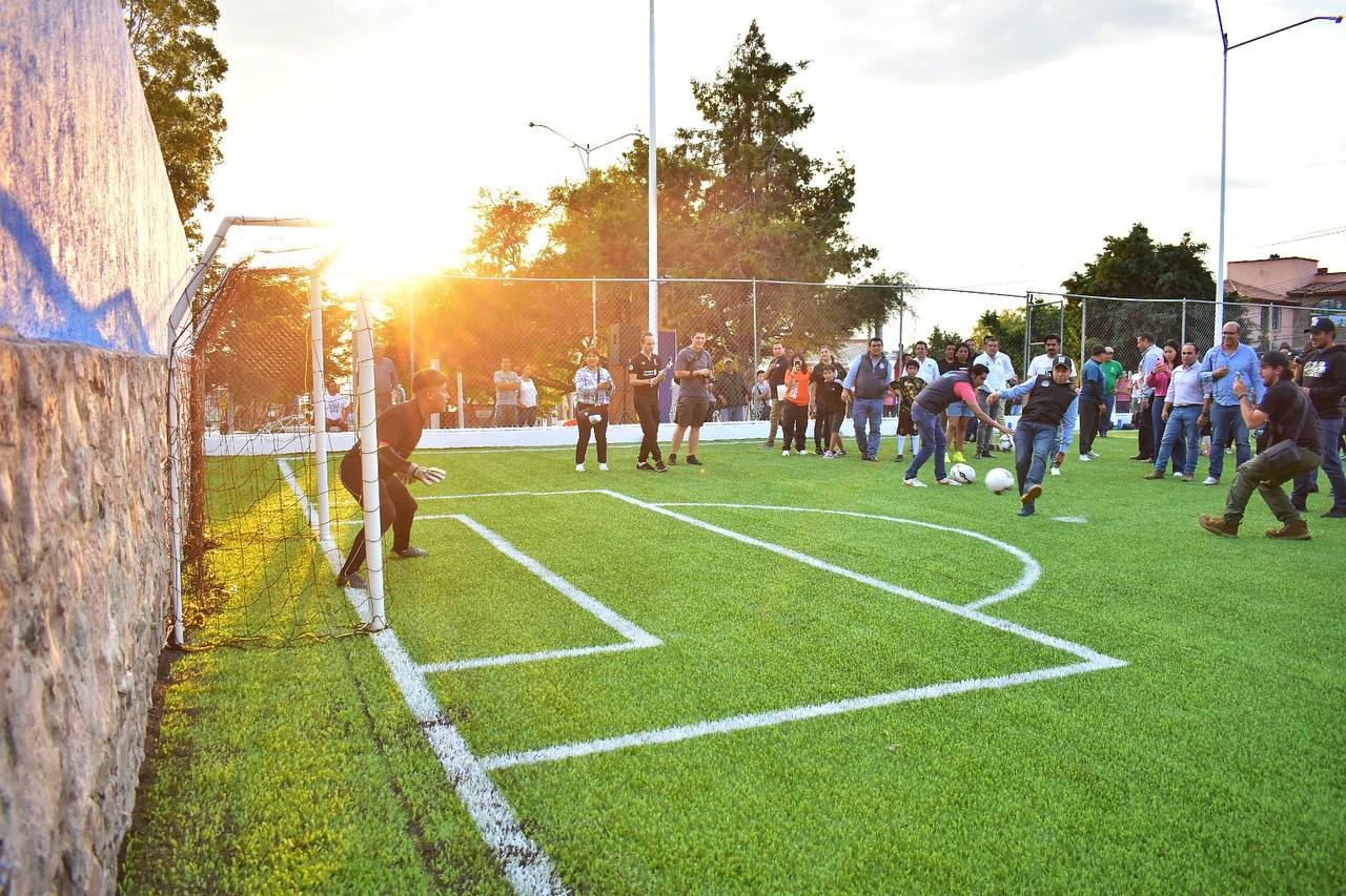 “Estamos en la entrega de esta rehabilitación de la cancha de fútbol, a la cual se le intervino con pasto sintético, con todos lo que fue la barda perimetral, con la iluminación se mejoró y, prácticamente, esta cancha estará abierta, solamente la maya es para que no se les salgan los balones y que puedan jugar mejor los niños; las porterías también con sus redes.