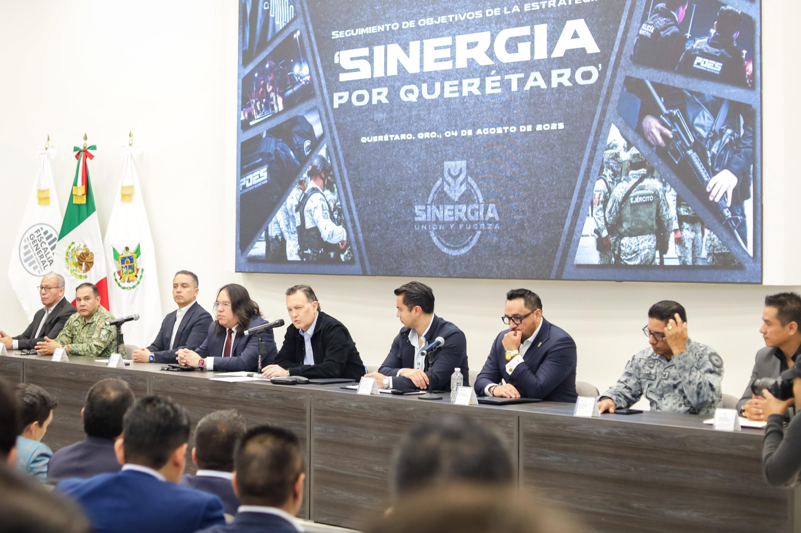 En representación del presidente municipal de Corregidora, Chepe Guerrero, acudieron a la reunión de seguimiento de la estrategia “Sinergia por Querétaro” la secretaria de Gobierno, Cristina Fernández de Cevallos, y el secretario de Seguridad Pública, Ángel Rangel Nieves.