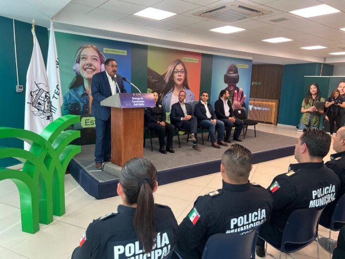 Durante la ceremonia de entrega de constancias, celebrada en el Aula Magna de Tecmilenio, el secretario de Seguridad Pública, Ángel Rangel Nieves, resaltó el interés del alcalde Chepe Guerrero por impulsar el desarrollo humano del personal operativo.