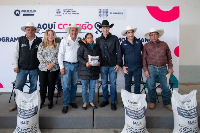El presidente municipal de El Marqués, Rodrigo Monsalvo Castelán, junto con el secretario de Desarrollo Agropecuario del estado de Querétaro (SEDEA), Rosendo Anaya Aguilar, encabezaron la entrega de 479 toneladas de maíz para consumo humano, como parte de un programa de apoyo dirigido a productores afectados por las condiciones climáticas registradas durante el último año.