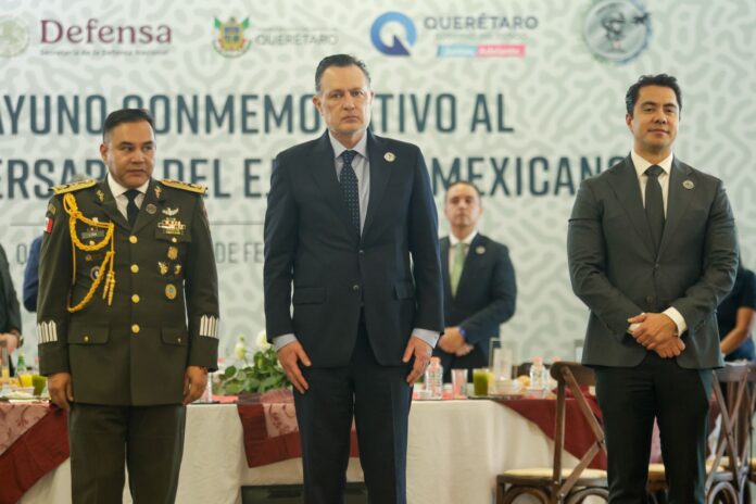 El presidente municipal de Querétaro, Felifer Macías, acompañó al gobernador del estado, Mauricio Kuri González, y al General de Brigada Diplomado de Estado Mayor José Guillermo Lira Hernández, comandante de la 17ª Zona Militar, durante el desayuno conmemorativo por el CXIII Aniversario del Ejército Mexicano.