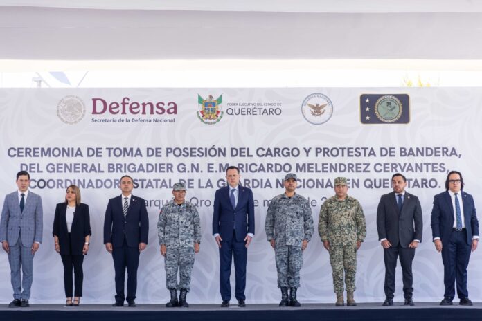 El gobernador de Querétaro, Mauricio Kuri González, asistió a la toma de posesión y protesta de bandera del general Ricardo Melendrez Cervantes, quien asumió como coordinador estatal de la Guardia Nacional en la entidad.